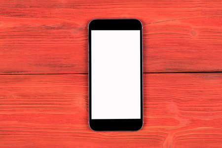Mobile phone with blank screen mock up isolated on red wood table background. Smartphone on wood table. Smartfone white