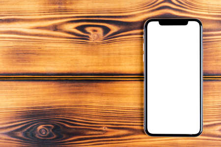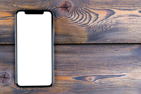Smartphone mockup with solid white color blank empty isolated screen on wooden background. Black mobile phone top view flat lay with copy space. Ready for content. Room for text