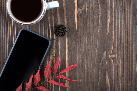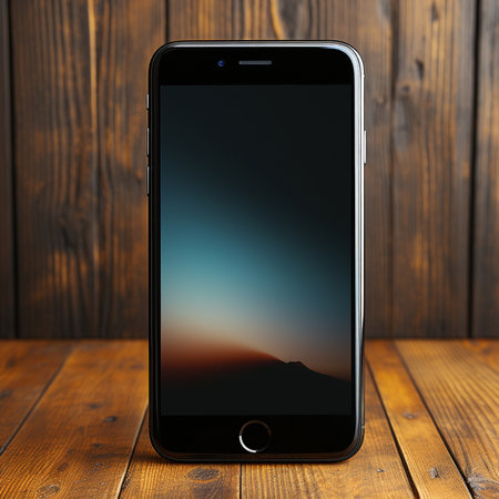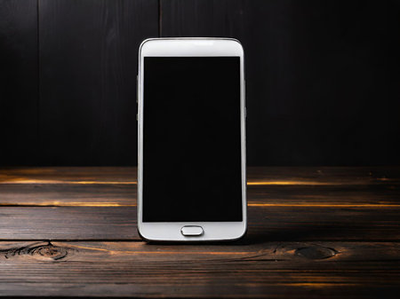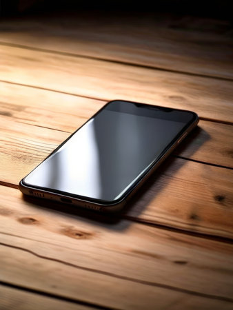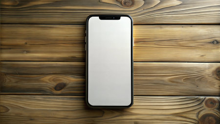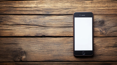 A blank smartphone positioned on a rustic wooden table. This image provides a clean, minimalistic look ideal for technology and lifestyle applications.