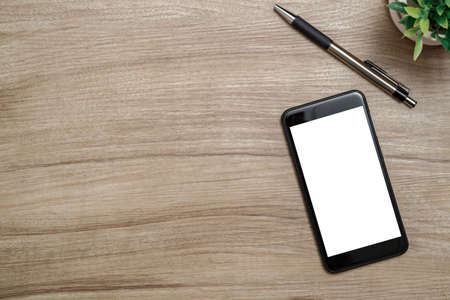 Smartphone with Mockup image white screen On Wooden Table With beautiful patterns And copy space for adding content. Smartphone concept and lifestyle. Have clipping path