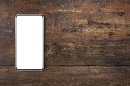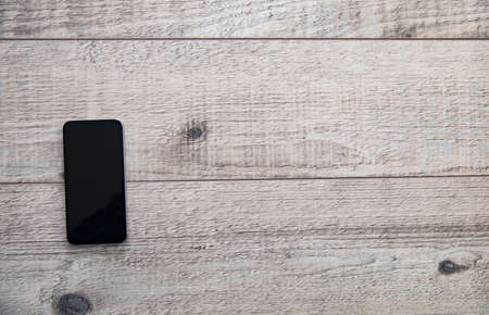 Black mobile phone with blank white screen on rustic wooden table. Minimalistic top view of workspace with copy space.
