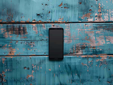 A black smartphone with a blank screen lying on weathered teal wood, combining elements of age and technology.