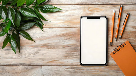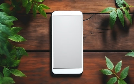 Smartphone mockup with blank screen and green leaves on wooden background.