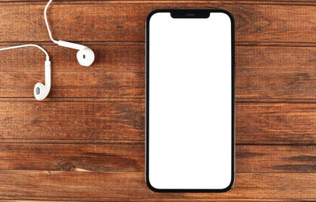 smartphone mockup iPhone 12 Pro Max with blank white screen on wood desk and EarPods headphones, top view. Apple is a multinational technology company. Moscow, Russia - January 14, 2021