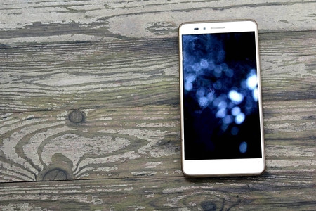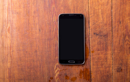Above view of smart phone with a shiny black frame. Placed on a wooden floor that is a variety of beautiful.