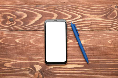 Mockup cellphone on wooden table. wooden western rustic table with smartphone. Blank screen mobile phone on brown wooden board background with copy space. Mobile phone on wooden table
