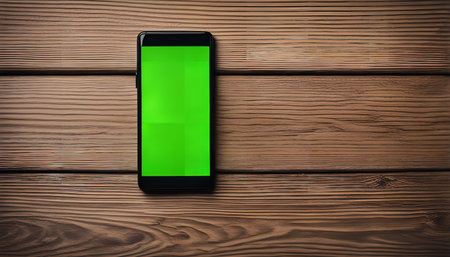 A modern smartphone with a green screen display lying on a wooden background. The image is perfect for showcasing mobile apps, websites, or video content.
