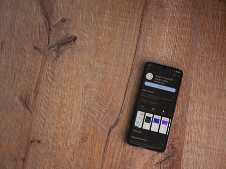 Lod, Israel - July 16,2023: Isracard app play store page on smartphone on wooden background. Top view flat lay with copy space.