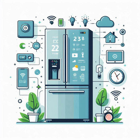 Modern flat design vector illustration concept of smart home technology. Smart fridge with smart home appliances and devices.