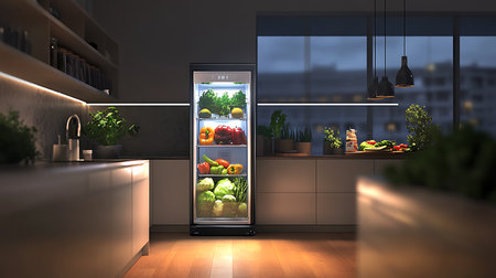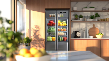 Experience a modern kitchen scene featuring a sleek refrigerator filled with vibrant, fresh food. Inviting ambiance highlighting culinary creativity and organization.