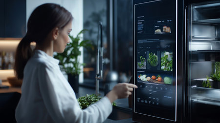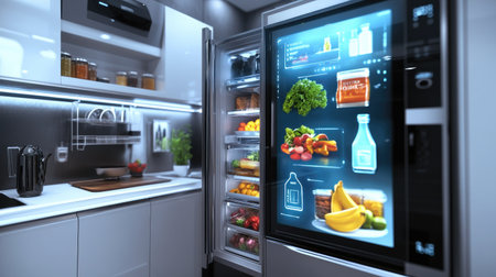 Modern kitchen featuring a smart refrigerator with a digital display showing nutritional information, enhancing meal planning and promoting healthy eating habits
