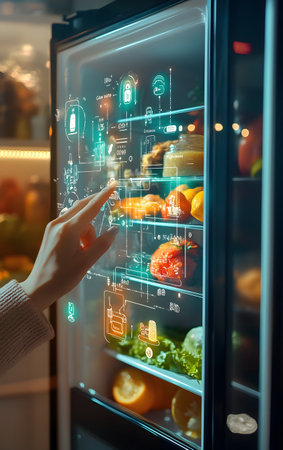A smart refrigerator displaying organized food inventory and supplies