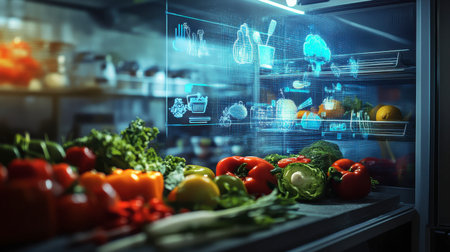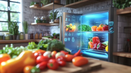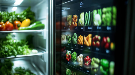 A sleek, smart refrigerator filled with colorful vegetables and meal suggestions, enhancing kitchen organization.