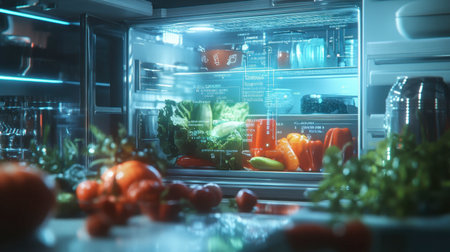 Modern kitchen with smart refrigerator interior displaying organized fresh produce. That the image is generated using AI.