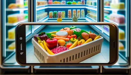A vibrant smartphone displays fresh tomatoes, lettuce, and lemon with a splash effect, symbolizing healthy eating and modern digital lifestyle in a refrigerator.