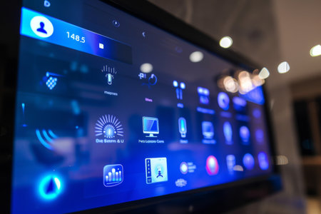A large screen with a digital clock displaying the time for easy time management and tracking., A smart home control panel with touch screen interface, AI Generated