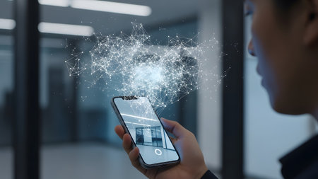 Hand holding smartphone with abstract polygonal network on screen over blurred bokeh background