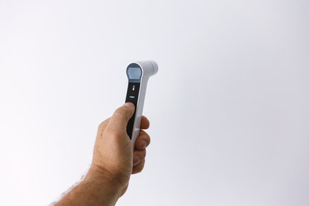 Hand holding contactless thermometer, showing temperature 36.6 degrees by Celsius on white background. Temperature measurement.