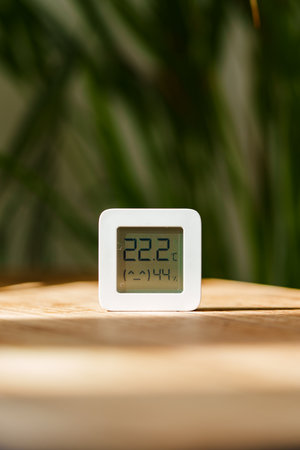 White Digital Thermometer Displaying Temperature and Humidity on Wooden Table With Green Plant in Background
