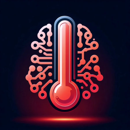 A hand adjusts a smart thermostat with holographic screens displaying temperature and energy...