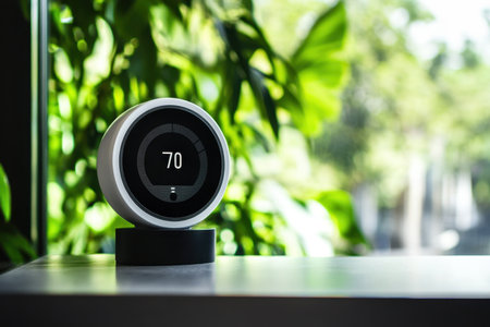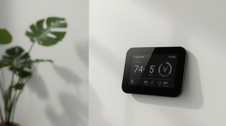 A sleek smart thermostat indicates a temperature of 70 degrees in a bright, plant-filled room.
