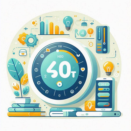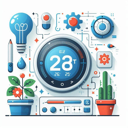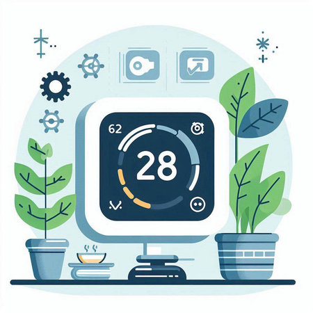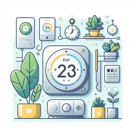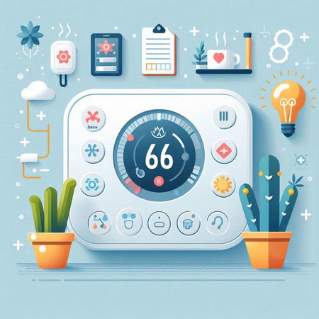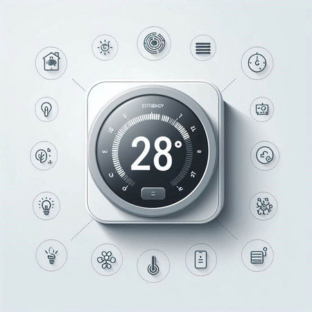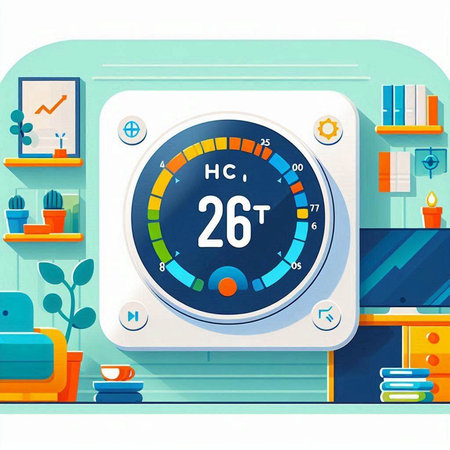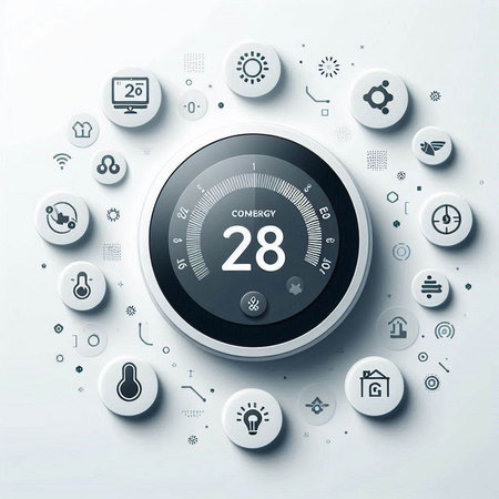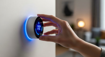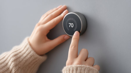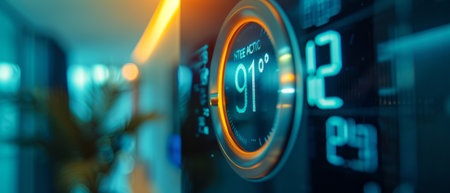 A hand adjusts a smart thermostat with holographic screens displaying temperature and energy...