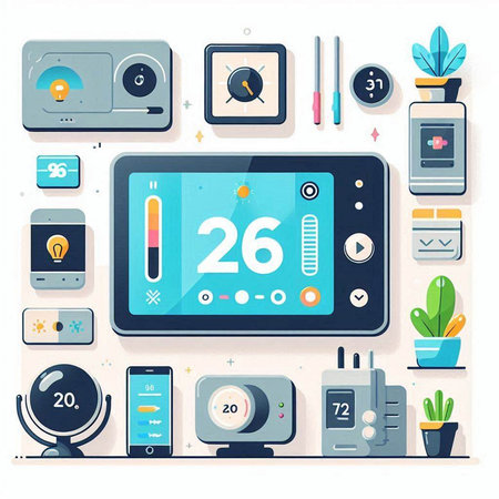 Screen of a smart digital thermostat with the external and target temperatures indicated. Rotary dial to control and adjust. Scheduling and programmable domestic heating. White wall and black frame