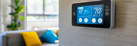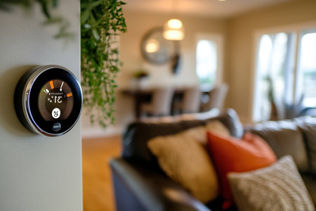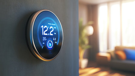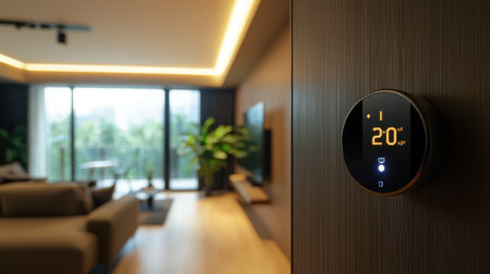 A stylish smart thermostat shows 31 degrees in a well-lit living room adorned with comfortable furniture.