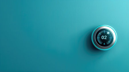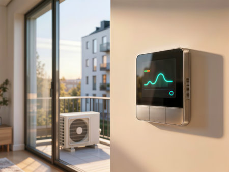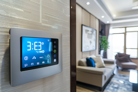stylish smart home temperature control, sleek glass thermostat with blue backlight and remote icons, contemporary apartment corridor featuring modern thermostat with calibration features