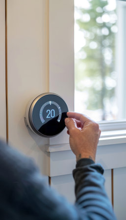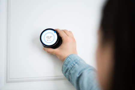 Close up of a person hand adjusting temperature on thermostat through smart phone at home