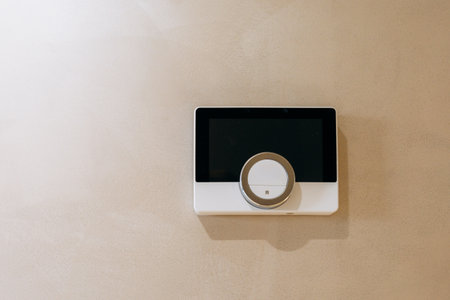 Round smart thermostat with touch screen installed on the wall indoors. Smart home heating regulation concept. View with copy space