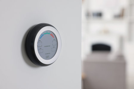 closeup of digital climate control thermostat for adjust temperature mode at home