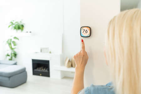 Smart home digital thermostat touch screen woman touching touchscreen to adjust temperature of heating in living room wall