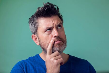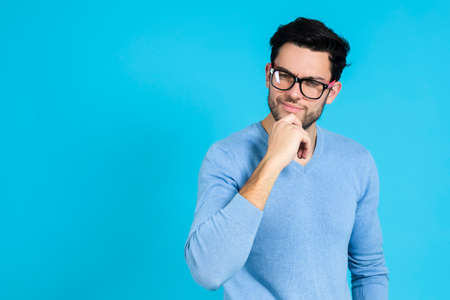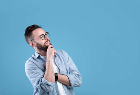 Pensive Caucasian guy thinking over decision or problem, looking at empty space over blue studio background. Thoughtful bearded man hoping, imagining,making choice