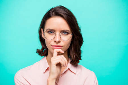 Close-up profile of nice cute attractive pretty charming curly-haired lady in formal shirt round glasses thinking touching chin isolated over turquoise teal pastel background