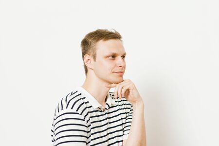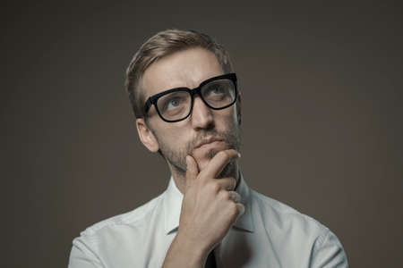 Thoughtful young man thinking about a new idea and using his imagination next to copy space