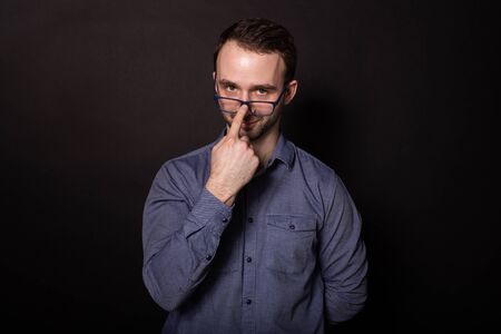 Worried and uncertain young man in casual clothes and glasses looks pensive. Concept Portrait, Emotions, Uncertainty, Casual, Eyeglasses