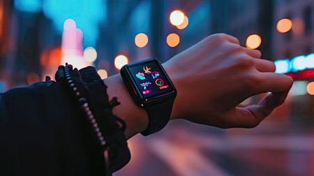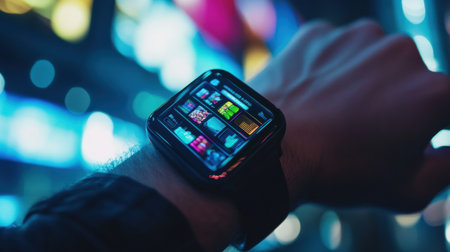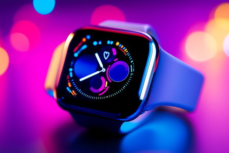 Close-up of a modern smartwatch against vibrant bokeh lights
