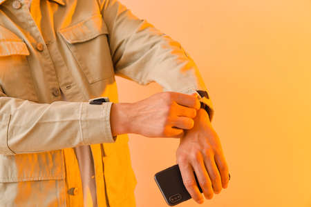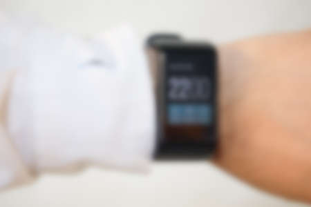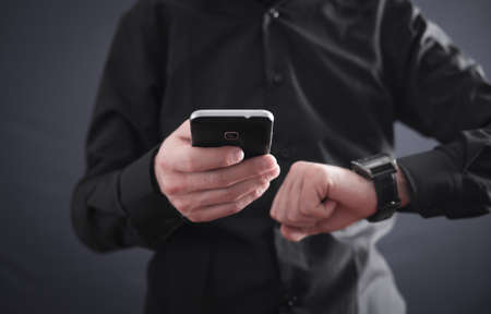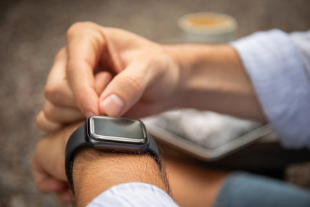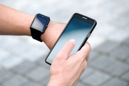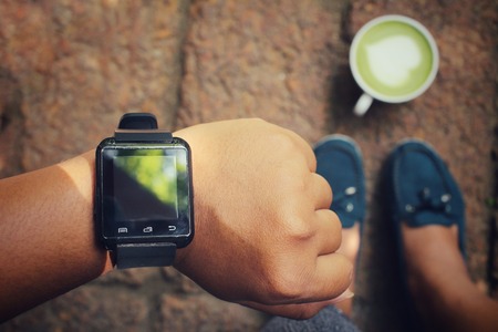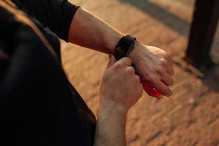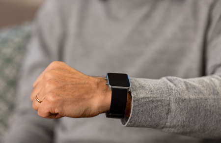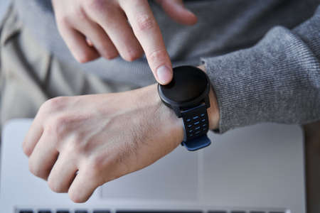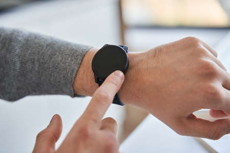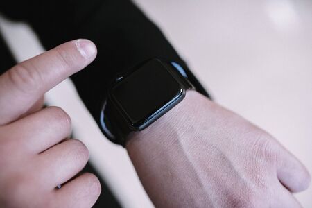 Man checking time on his smartwatch device Close-up display clock checking lifestyle communication phone mobile touch app technology