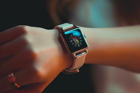Close up of young woman wrist wearing smartwatch with bright light background.