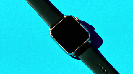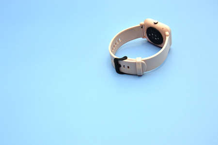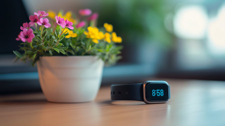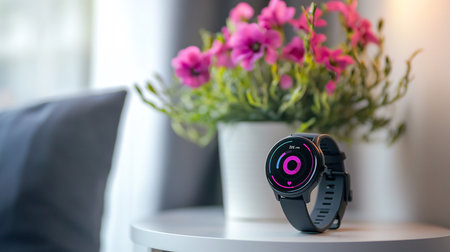 Smart watch on the table with flowers in the background. Smartwatch is a wearable technology.