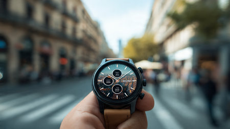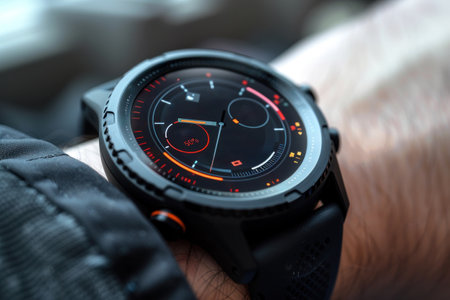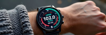 Modern smartwatch on male wrist displaying fitness data in vibrant colors. That the image is generated using AI.