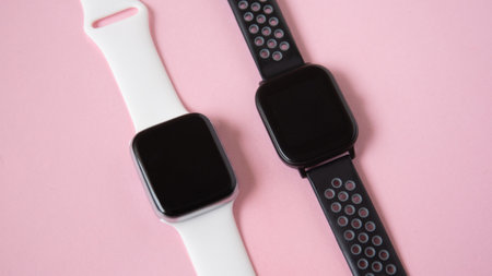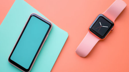 Phone and smartwatch duo on a pastel background, minimal lifestyle flat lay for modern tech use with empty space