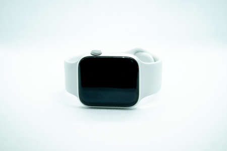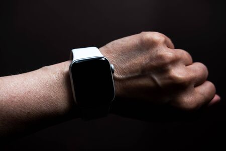 Chekhov, Russia - July 19, 2019: Apple Watch Series 4 white color with hand. A new watch from an Apple company closeup isolated on dark background