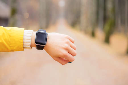 Bali Indonesia June 2, 2020 : female hands using with apple, Apple Watch is a line of smartwatches designed, developed, and marketed by Apple Inc.