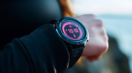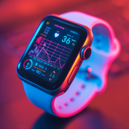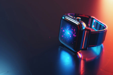 A sleek smartwatch glows with colorful health metrics, capturing attention in a captivating evening atmosphere.