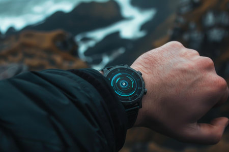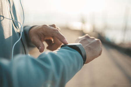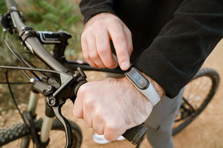 Hiker is wearing a smartwatch on his wrist and checking the time