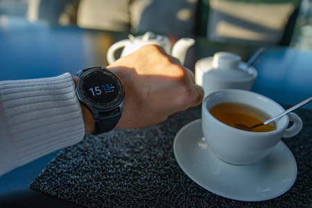 man looking on watch sitting in cafe waiting for meeting. drinking tea