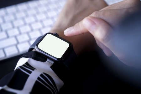 Bali Indonesia June 2, 2020 : Smart watch isolated, blank screen in female hands