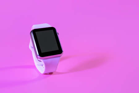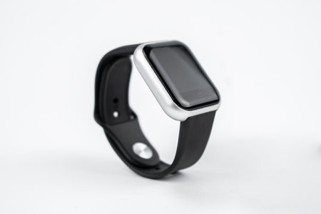 Digital fitness tracker smart band with touch screen isolated on white background. Stock Photo